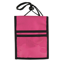 Ideal for most passports; hoop & loop closure top flap opening; Large main pocket; Clear PVC front pocket for badge; Open flap pocket; Rear open pocket and double pen holders; Adjustable strap using push button lock; Clear vinyl strip on the back for trade show ribbons.