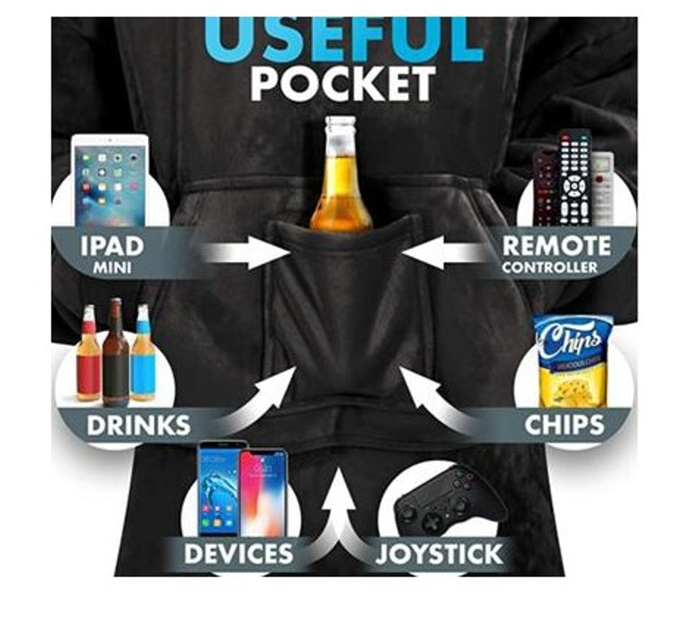The oversized wearable blanket is equipped with giant front pockets that can store your mobile devices, such as phone, tablet, and remote controls, also snacks, beers. The sweater blanket also has large sleeves, oversized hood, elastic cuffs and wide neck design which allow you to move your limbs and body easily